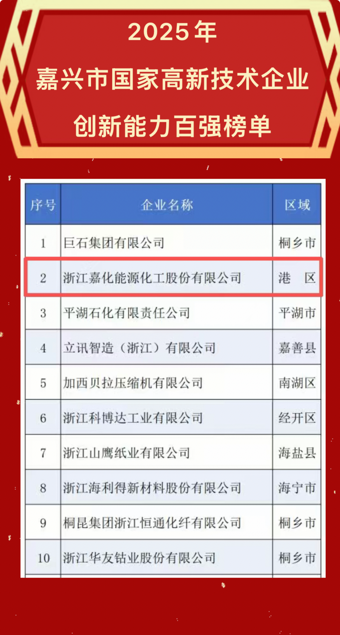 嘉化能源获评嘉兴市国家高新技术企创新能力百强第二位