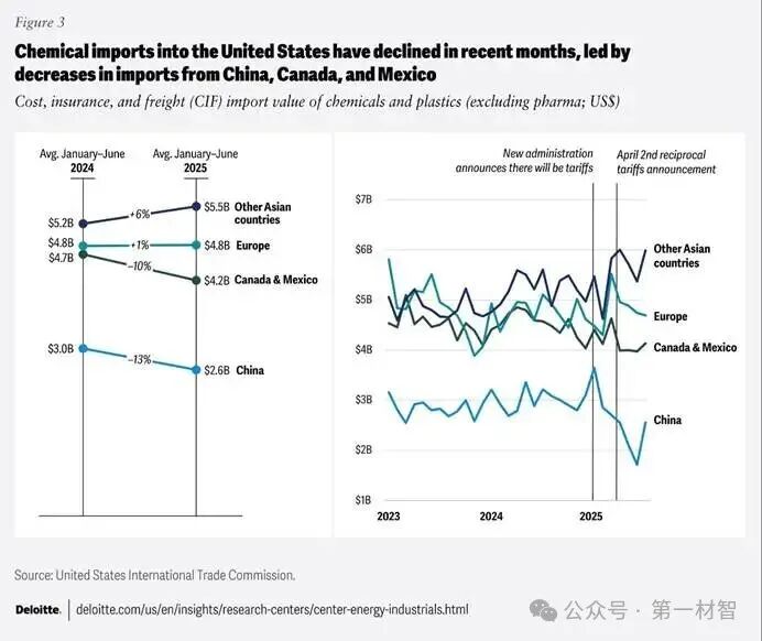 (2)地缘政治与贸易紧张局势,再加上持续发酵的贸易摩擦,正深刻重塑全球供应链格局,导致企业投资决策推迟、贸易额缩减。数据显示,2025年美国化工品进口量预计将跌至2020年以来的最低水平,出口量则将触及2021年以来的最低点。