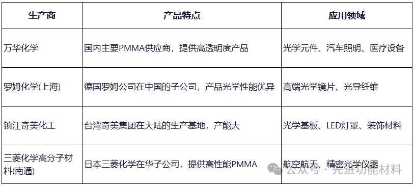 聚甲基丙烯酸甲酯(PMMA,有机玻璃)PMMA是光学性能最好的塑料之一,透光率高达92%,折射率为1.492,长期使用温度为80℃。PMMA在相机取景器、投影电视、菲涅尔透镜、光盘和光纤等领域应用广泛。全球主要生产商包括: