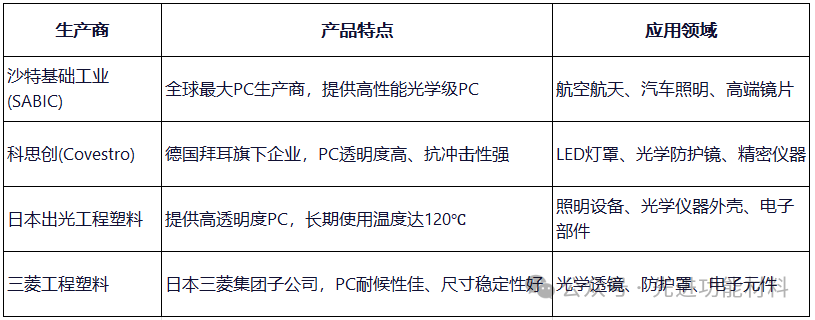 聚碳酸酯(PC)PC在光学性能上仅次于PMMA,透光率为88%,折射率为1.586,具有出色的抗冲击性和耐温范围(-135℃~+120℃) 2 。PC广泛应用于航空玻璃、非球面透镜等领域。主要生产商包括:
