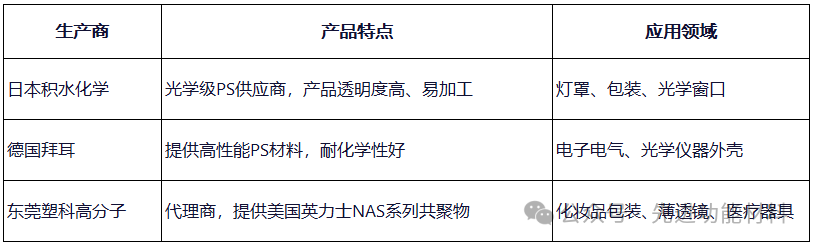 聚苯乙烯(PS)PS与PMMA、PC并称为三大透明塑料,透光率为88%,但双折射率较大,耐候性较差,长期存放会发黄变浊。PS主要用于一般光学应用,如灯罩、包装材料等。主要生产商包括: