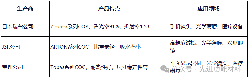 环烯烃聚合物(COP/COC)COP/COC是近年来发展的高性能光学塑料,具有低双折射率、高耐热性(长期使用温度可达170℃)、低吸水性(仅为PMMA的1/10)等特点。COP/COC在手机镜头、医疗器械、光学薄膜等领域应用广泛。主要生产商包括: