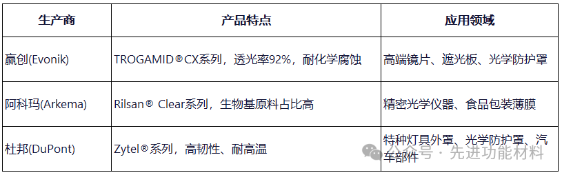 透明聚酰胺(尼龙)透明尼龙具有透光率高(92%)、耐化学腐蚀、低吸水率(如飞利浦PACP-9/6仅为1%)等特点,适用于精密光学仪器、耐压视窗等场合。主要生产商包括: