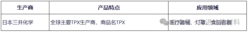 TPX(聚4-甲基戊烯-1)TPX是唯一一种结晶性光学塑料,密度仅为0.83g/cm³,吸水率极低(0.01%),透光率90%~92% 2 。TPX广泛应用于医疗器械、家用电器等领域。主要生产商为: