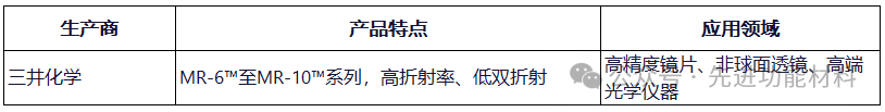 MR™聚氨酯树脂MR™是三井化学开发的高折射率光学材料,具有1.60~1.74的高折射率、31~41的高阿贝数、低比重和高抗冲击性等特点。MR™树脂主要用于高精度镜片和非球面设计。主要生产商为: