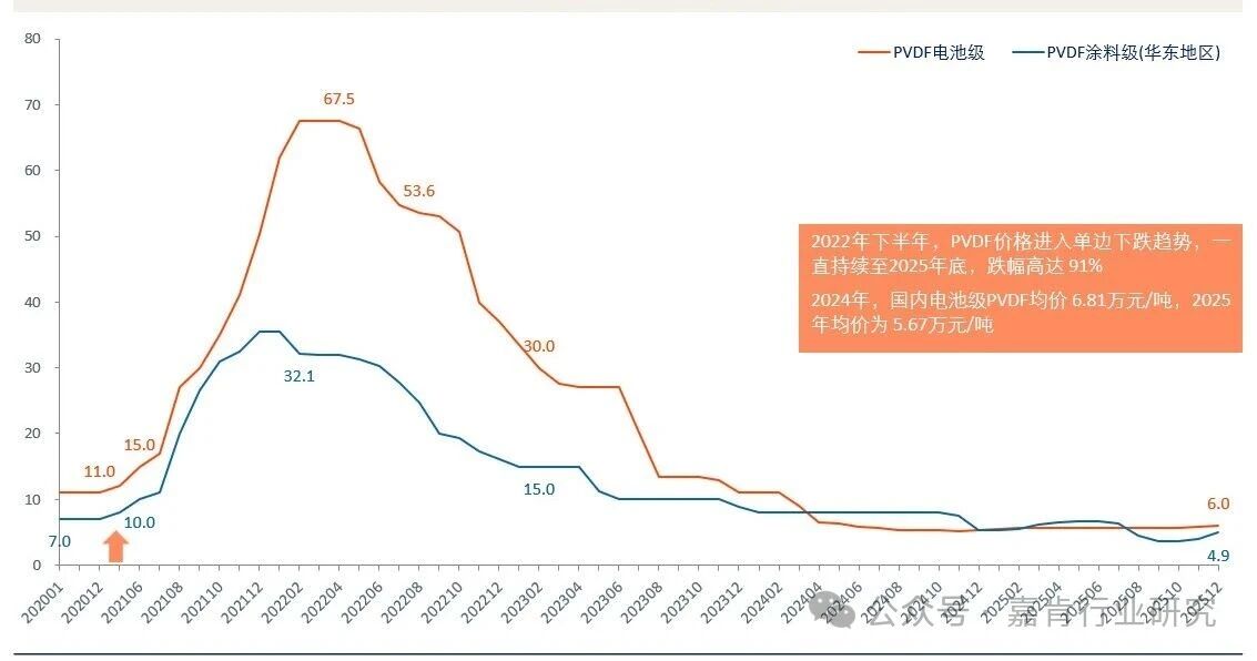 国内聚偏氟乙烯(PVDF)行业在 2022年第二季度达到产业景气高峰后进入调整周期,至今未走出低谷,三年来产品价格持续回落。从历史的发展轨迹来看,2025年底 PVDF行业应该迎来向上的拐点,但多家企业新建产能的集中释放,增加了市场结构调整的复杂性。