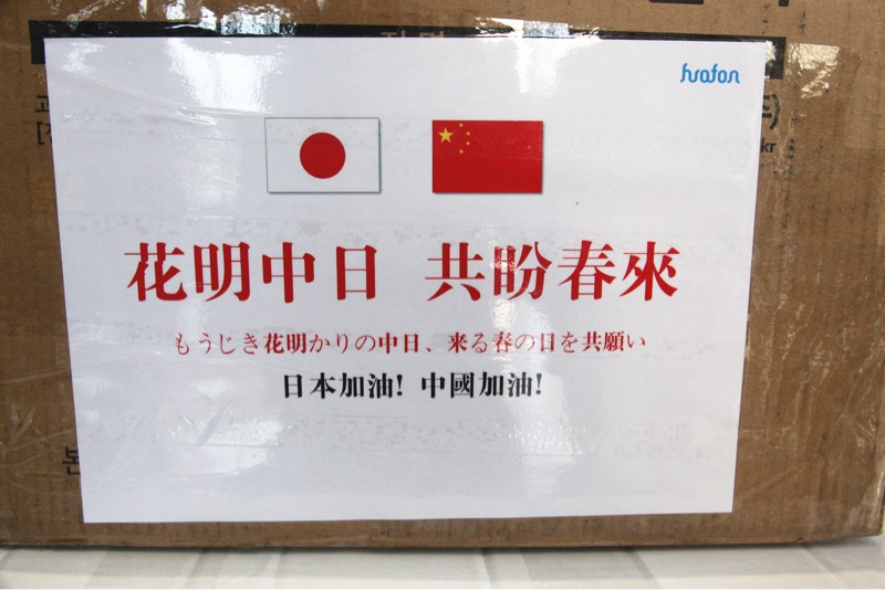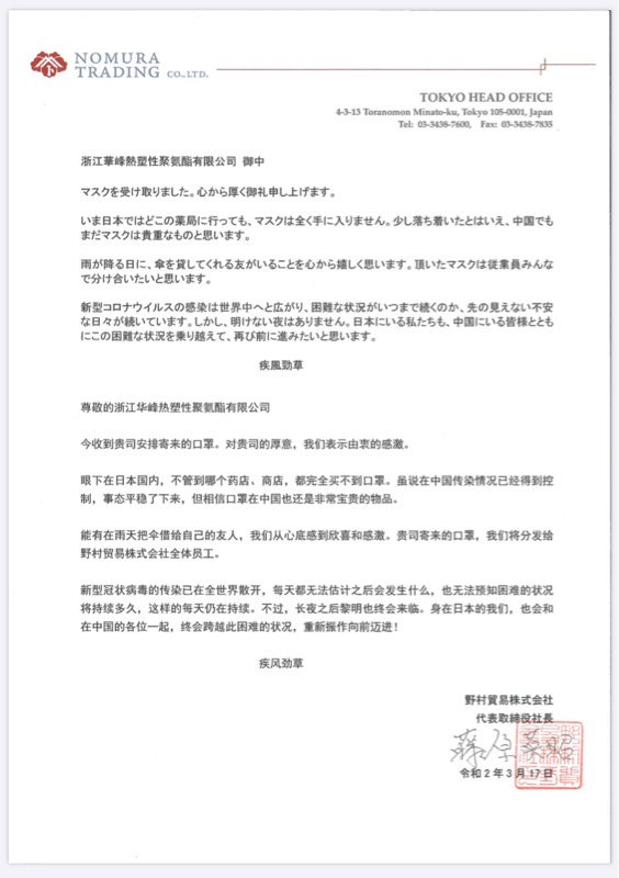 “花明中日、共盼春来”在华峰发往日本的救援物资上,不仅印上了中国和日本两国国旗,还特意用日文写上了为他们加油打气的话。当地经销商收到之后格外感动,向华峰发来的感谢信:能有在雨天把伞借给自己的友人,我们从心底感到欣喜和感激。