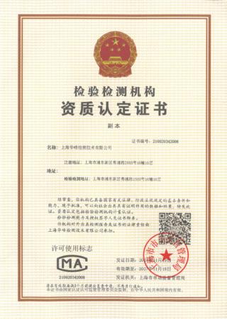 经过评审,上海市市场监督管理局最终认定上海华峰检测技术有限公司符合RB/T《检验检测机构资质认定能力评价 检验检测机构通用要求》的要求,并于11月19日颁发检验检测机构资质认定证书。