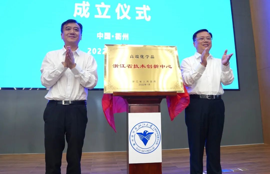 本刊讯 6月16日上午,浙江省高端化学品技术创新中心正式揭牌成立。该中心建设由衢州市政府统筹推进,以巨化集团有限公司和浙江大学衢州研究院为核心共建单位,中巨芯、衢州学院、北京化工大学等企业和院校参与。省科技厅厅长高鹰忠,浙江大学党委常委、副校长王立忠,中国工程院院士、浙大衢州“两院”院长任其龙,衢州市委书记高屹,市委副书记、市长徐张艳,市人大常委会主任吴国升,市政协主席方健忠,市委常委,巨化集团有限公司党委书记、董事长周黎旸等领导出席。