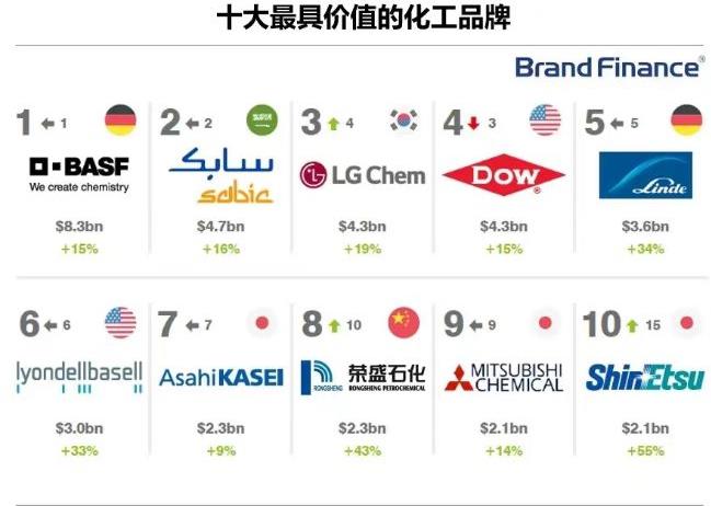 本刊讯 5月31日,Brand Finance发布的最新化工企业品牌25强报告中,中国入选25强的所有化工企业的品牌总价值位居第四,仅排在德国、美国和日本之后。荣盛石化的品牌价值评估为23亿美元,同比增长42.9%,成为今年化工企业25强中最具价值也是唯一入榜前十的中国品牌。