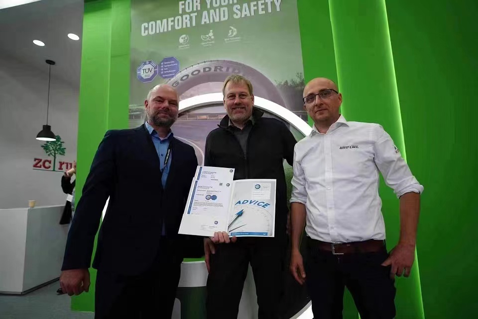 在科隆展期间,全球最权威的第三方认证机构德国TÜV南德集团现场为西湖和好运的1号旗舰乘用车胎颁发了TÜV MARK证书。