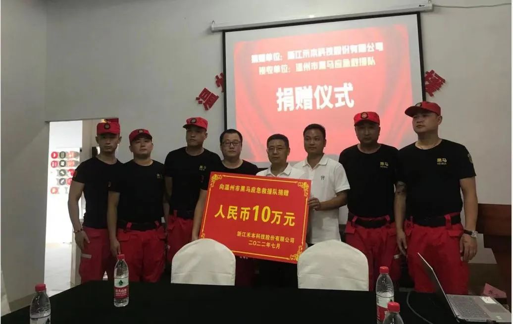 本刊讯 7月26日下午,在温州市黑马救援队会议室,举行了浙江禾本科技股份有限公司向温州市黑马应急救援队捐赠10万元仪式,集团公司副总经理徐瑶出席了捐赠仪式。