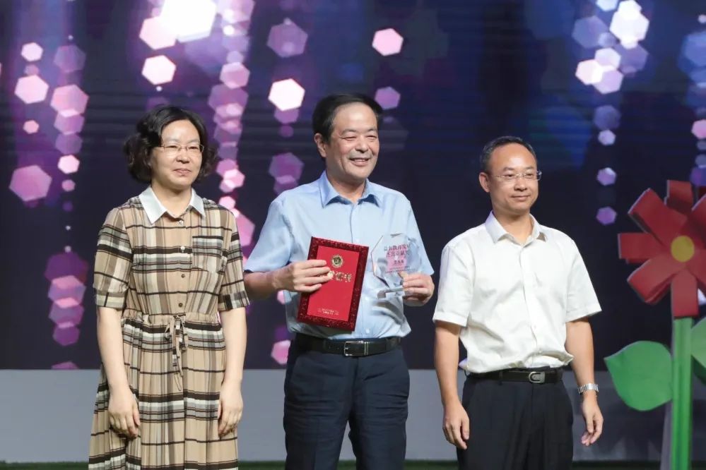 9月10日,在益农镇庆祝第38个教师节暨荣盛教育奖励基金成立20周年大会上,萧山区人大常委会副主任古涛、副区长杨新程为李水荣颁发益农教育发展杰出贡献奖奖牌和证书。(荣盛集团供稿)