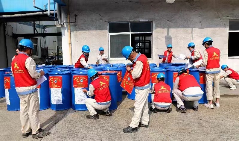 为保证车程顺利,保障这批消毒剂能够第一时间派上用场,灌装现场干部、党员以及骨干员工们顶着烈日冲锋在前与时间赛跑,争分夺秒为抗灾献力,15:10左右全部罐装完成。