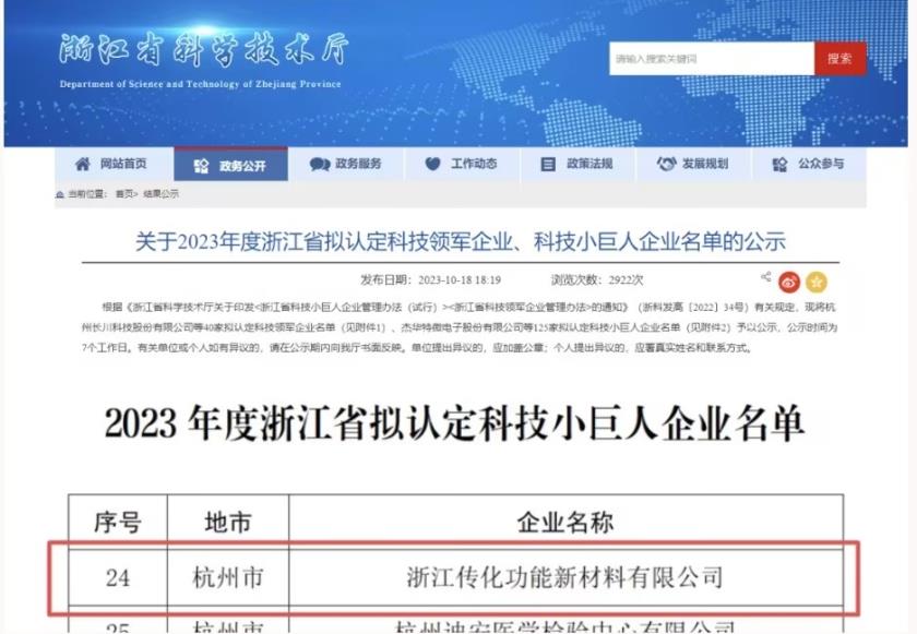日前,浙江省科学技术厅发布《关于2023年度浙江省拟认定科技领军企业、科技小巨人企业名单的公示》文件,传化化学下属浙江传化功能新材料有限公司获“科技小巨人企业”认定。