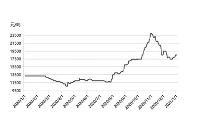 2020年,MDI市场整体呈现前低后高的态势,下半年在国内外装置频繁检修的利好提振下,市场不断震荡上行,年度最低价和最高价差约为1.35万元(吨价,下同),振幅达120%左右。