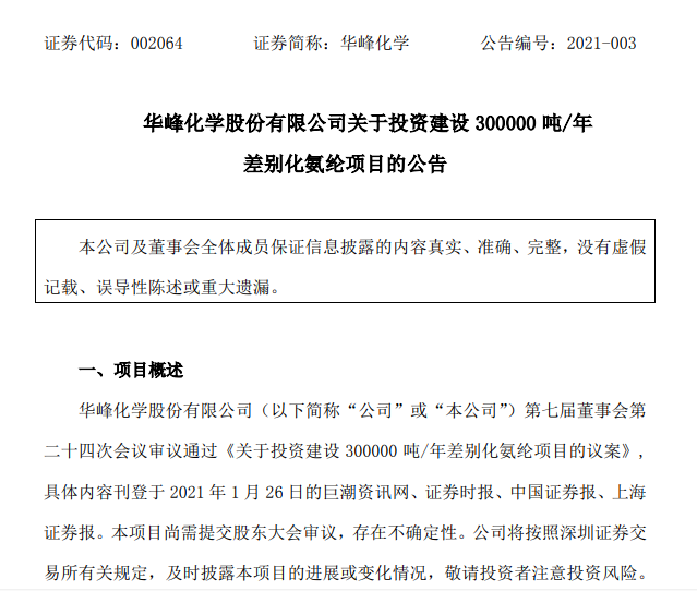 华峰化学今日(1月26日)发布公告称,为巩固扩大整体竞争优势,进一步优化公司产品结构,以打造国际领先的高技术纤维及新材料制造基地并成为国际一流企业为目标,公司控股子公司华峰重庆氨纶有限公司投资建设 300000 吨/年差别化氨纶项目。 公告显示,该项目预计总投资436,000 万元,资金来源为银行贷款及自筹,项目建设期预计为72个月,分三期实施。(第一期:5 万吨/年建设期预计 24 个月,第二期:15 万吨/年建设期预计 24 个月,第三期:10 万吨/年建设期预计 24 个月)。工艺技术采用大容量连续聚合、干法纺丝等工艺路线,全部采用自动化、智能化、高效节能、高密度多头纺生产线。 华峰公司表示,该项目投产后公司整体规模将进一步扩大,差异化产品比重将进一步提高,市场占有率和影响力将显著提升。新项目采用的新设备、新工艺、新技术将进一步降低公司整体生产成本,并为公司带来较为丰厚的利润回报。