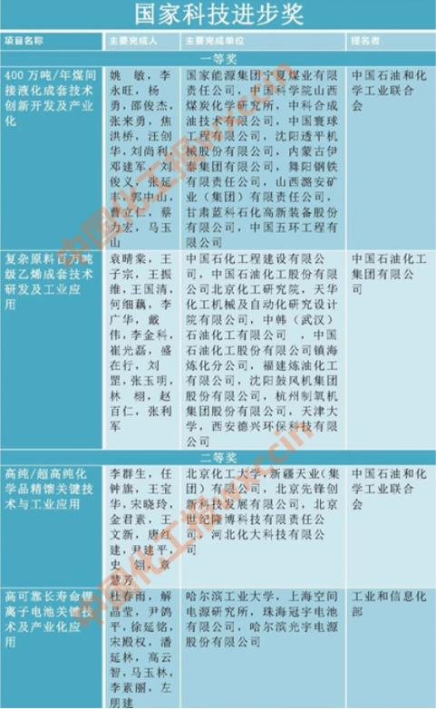 400万吨/年煤间接液化成套技术创新开发及产业化,复杂原料百万吨级乙烯成套技术研发及工业应用荣获一等奖;高纯/超高纯化学品精馏关键技术与工业应用、高可靠长寿命锂离子电池关键技术及产业化应用、催化裂化汽油超深度加氢脱硫-烯烃分段调控转化成套技术荣获二等奖。