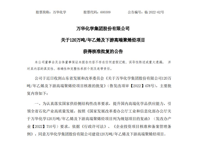 中化新网讯 万华化学8月22日下午发布公告,近日收到山东省发展和改革委员会的核准批复,同意万华化学集团股份有限公司建设120万吨/年乙烯及下游高端聚烯烃项目。 项目总投资176亿元,建设地点位于烟台化工产业园。主要建设120万吨/年乙烯裂解装置、25万吨/年低密度聚乙烯(LDPE)装置、2×20万吨/年聚烯烃弹性体(POE)装置、20万吨/年丁二烯装置、55万吨/年裂解汽油加氢装置(含3万吨/年苯乙烯抽提)、40万吨/年芳烃抽提装置以及配套辅助工程和公用设施。