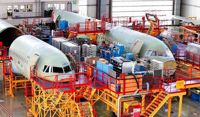 图为空客(中国)天津工厂A320系列飞机总装线。(中国石化 供图)