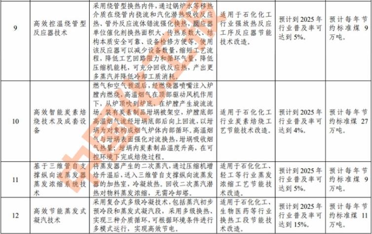 12月1日,工业和信息化部网站公布了《国家工业和信息化领域节能技术装备推荐目录(2022年版)》,目录包括钢铁、有色、建材、石化化工、机械、轻工、电子等11个工业领域节能技术。 石化化工行业节能提效技术共有12项,分别是乙烯裂解炉节能技术、半水-二水湿法磷酸技术、等温变换技术、低品位热驱动多元复合工质制冷技术及装备、新型高抗腐蚀双金属复合节能技术、蒸汽锅炉节能装置、炼油加热炉95+技术、煤化工气化黑水余热回收技术、高效控温绕管型反应器技术、高效智能炭素焙烧技术及成套设备、基于三维管自支撑纵向流蒸发器蒸发浓缩系统技术、高效节能蒸发式凝汽技术。