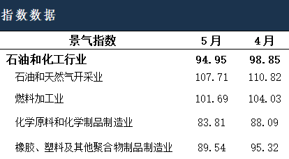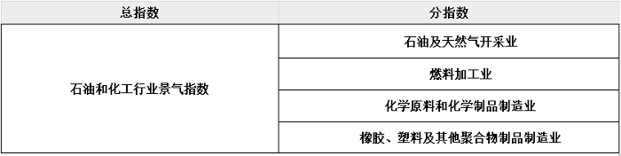 石油和化工行业景气指数由中国石油和化学工业联合会与山东卓创资讯股份有限公司联合编制,是石油化工行业的微观景气循环监控指标,包括“石油和天然气开采业景气指数”“燃料加工业景气指数”“化学原料和化学制品制造业景气指数”“橡胶、塑料及其他聚合物制品制造业景气指数”4个分指数。石油和化工行业景气指数的景气指标选择以度量行业的潜在产出和经济效益为标准,包括生产类微观数据和行业效益类数据,生产类微观数据包括:产能利用率、产品盈利能力、产成品库存水平。基础数据来源于与千余家企业建立的定期调研评估结果。
