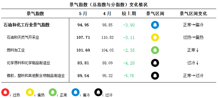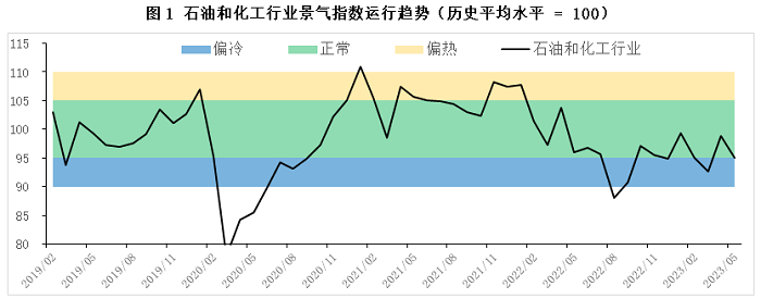 2023年5月,石油和化工行业景气指数回落,降至94.95,较2023年4月下降3.9个百分点,略低于正常区间,暂处于偏冷区间;较2022年5月下降1.01个百分点,降幅快速收窄。