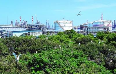 在镇海炼化厂区内,千余只白鹭在炼塔间的小树林栖息繁衍,构成一幅工业文明与生态文明和谐共生的美丽画卷。