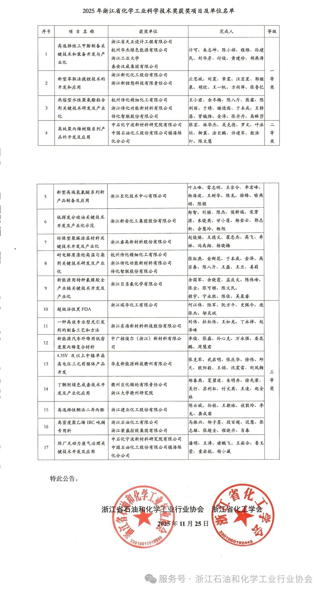 2025年11月4日,由浙江省石油和化学工业行业协会、浙江省化工学会联合组织的“2025年度浙江省化学工业科学技术奖”专家评审会,在浙江大学紫金港校区举行。经全体专家认真评议,共评出了一等奖3项,二等奖6项,三等奖8项,并在会后进行了为期一周的公示。现将获奖名单公告如下: